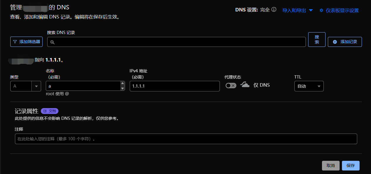 一、将要准备ddns的域名设置一条解析记录(ipv4设置A类型 ipv6设置AAAA类型) 目标地址随便填
